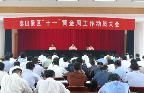 9月26日,泰山景区“十一”黄金周工作动员大会召开,景区党工委、管委会领导班子成员出席会议,各部门、各单位、相关村(居)、驻山单位主要负责人共计160余人参加了会议。景区党工委书记、管委会主任谭业刚主持会议并作重要讲话,党工委副书记李锋宣读了《泰山景区2007年“十一”黄金周工作方案》,管委会副主任万庆海宣读了《泰山景区防范和打击扰乱门票管理秩序不法行为奖励办法》。