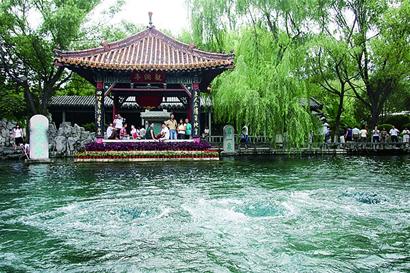 8月16日,众多游客在观赏欢腾喷涌、冲劲十足的趵突泉三股水。受近期连日多次降雨的影响,8月16日下午3时趵突泉地下水位攀升至28.91米,创下近三年来新高,比泉水复涌时的27.01米高出1.90米,实现了30多年来趵突泉最长喷涌周期。