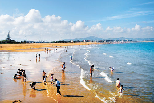 澄清蔚蓝的海水、细腻的金沙滩、蓝天白云、欢乐的游人……秋日下的日照海滨显得愈加迷人,绵延60多公里的金沙滩充分展现出“中国第一金滩”的魅力不凡。图为近日在山东省日照市万平口海滨风景区拍摄的画面。