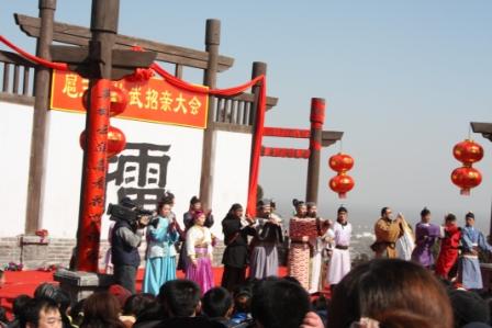 梁山水浒旅游热闹非凡。梁山风景区组织山东快书、莲花落、渔鼓、扬琴、唢呐、口技、碗乐、剪纸、吹糖人、捏面人、武术、坠子、琴书、舞龙、舞狮、赛马、水浒场景剧(“燕青打擂”、“真假李逵”、“好汉迎宾”、“杨志卖刀”)等民俗表演活动,展现梁山底蕴丰厚的水浒文化,并于大年初五举行“扈三娘比武招亲”活动,安排比武招亲之武术对演、民间婚庆仪式和宋江散宝等内容,由“宋江”主持将“扈三娘”许配予“矮脚虎王英”,并根据当地民间新娘娘家做花糕给婆家以祈求步步高、年年好的习俗,提前制作了一个重4600斤、高36层的大花糕,为“好客山东贺年会”献礼,成为水浒旅游的一大亮点。