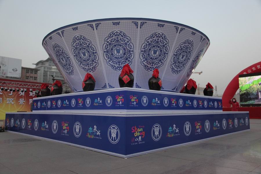 在活动现场,主办方设置了一个高3米,直径6米的巨型青花酒碗。该酒碗净高1.7米,两层底座1.3米,碗身绘有酒杯图案,整个作品细腻飘逸,传统韵味十足,让人禁不住想起周杰伦那首有名的《青花瓷》。青花酒碗表达了热情的泉城人民斟满美酒、真诚待客的喜悦之情。