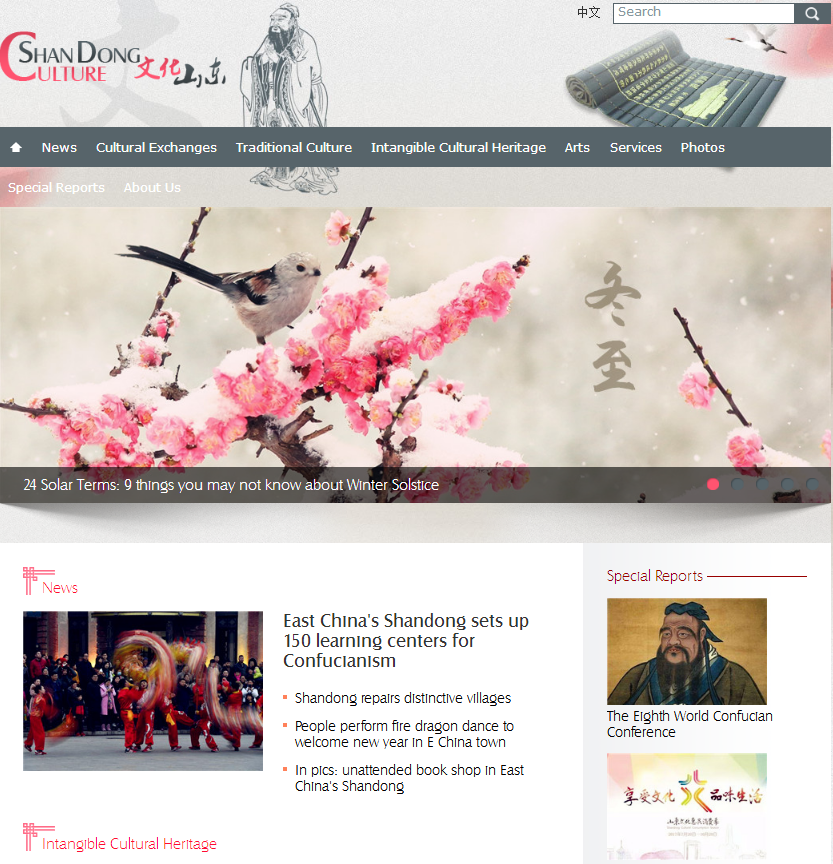 该网站由山东省文化厅与中国日报网合力打造,由中国日报网资深专家团队负责承建、设计和日常内容维护,以海外受众的视角设置了“文化资讯、对外文化交流、传统文化、非遗传承、文化艺术、文化设施、图片库”等十几个特色栏目,并策划了一批精品专题。