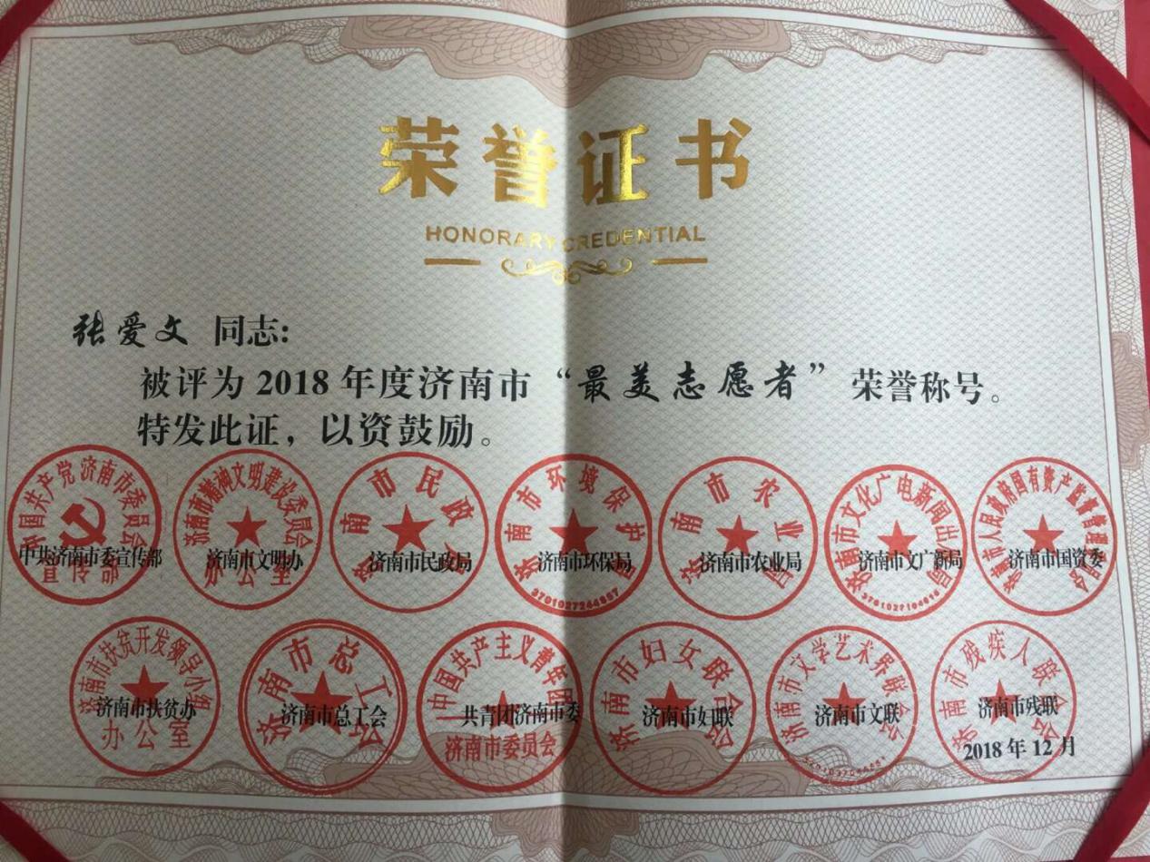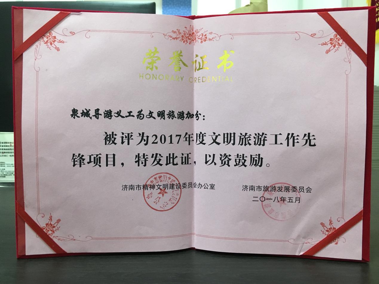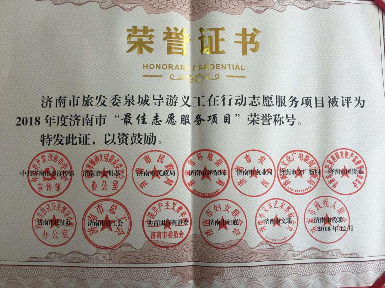 为贯彻落实习近平新时代中国特色社会主义思想和党的十九大精神,积极培育和践行社会主义核心价值观,推进学雷锋志愿服务制度化、常态化,济南市委宣传部、济南市文明办等部门和单位共同组织开展了2018年学雷锋志愿服务“四个100”先进典型评选活动,济南市旅游发展委员会“泉城导游义工在行动”入选济南市“最佳志愿服务项目”、泉城导游义工成员张爱文入选济南市“最美志愿者”先进典型。