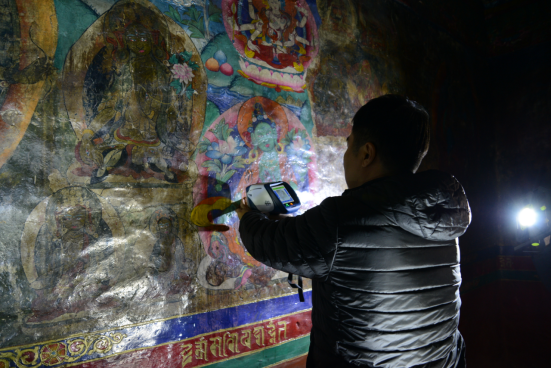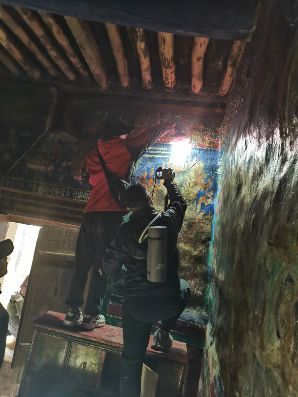 10月15日至20日,省古建筑保护研究院孟令谦院长带队一行 8 人,在海拔4300多米的高原环境中,克服了高原反应,完成了该项目的前期现场勘察和对佛殿内壁画的数字化信息采集工作。拜访了西藏自治区文物保护研究所,学习了西藏地区传统壁画制作工艺材料和壁画类佛殿建筑搬迁保护工作的经验做法,并为后期的搬迁保护工作提供了专业指导意见和建议。
