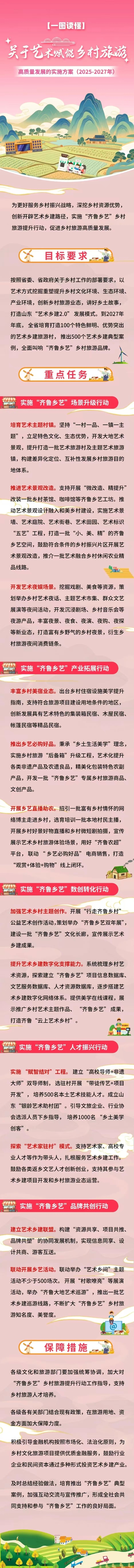 政策文件:山东省文化和旅游厅 山东省教育厅 山东省财政厅 山东省人力资源和社会保障厅 山东省自然资源厅 山东省农业农村厅 山东省商务厅 山东省大数据局 中共山东省委金融委员会办公室 山东省文学艺术界联合会 山东老年大学印发《关于艺术赋能乡村旅游高质量发展的实施方案(2025-2027年)》的通知